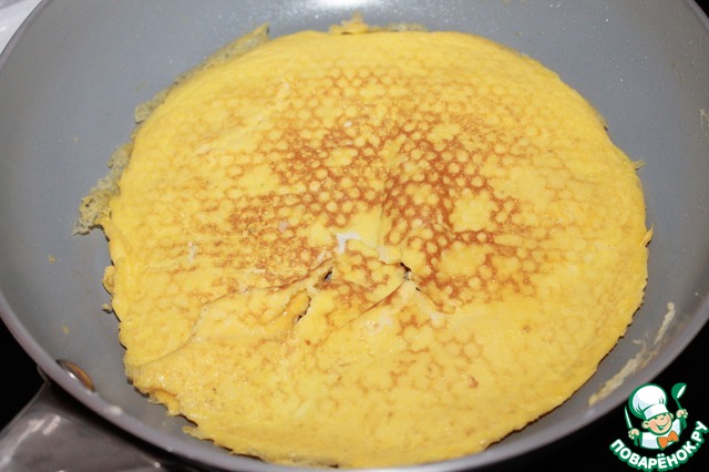 На раскаленной сковороде смазанной растительным маслом выпекаем яичный блин. Процедуру повторяем, нам необходимо три блина. Оставляем их остывать.