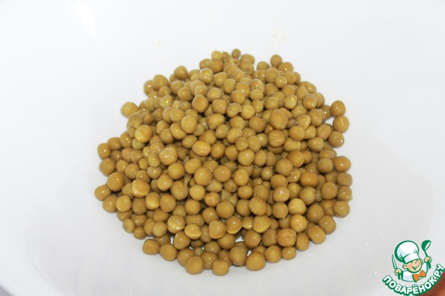 Консервированный горошек откидываем на дуршлаг и даем стечь жидкости. Лишняя жидкость в салате не нужна. Горошек отправляем в салатник.