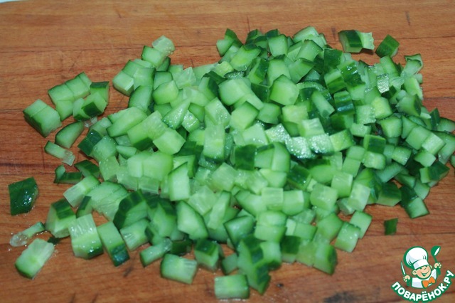 В салатник отправляем огурец и нарезанные блинчики. Все тщательно перемешиваем. Заправляем майонезом или сметаной. Солим и перчим по вкусу.