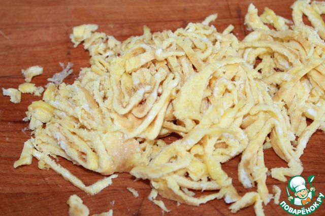 Нарезаем тонко, как на лапшу. Повторяем с оставшимися двумя блинами процедуру.