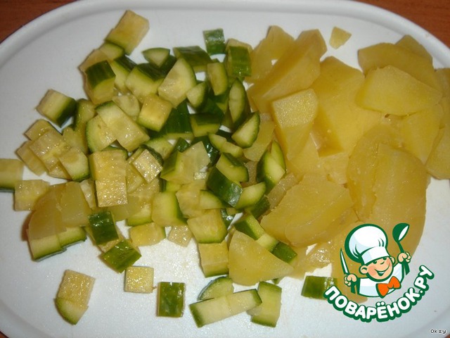 Порезать огурец и картофель мелкими кубиками.