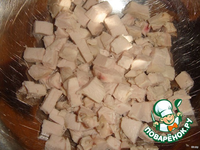 Куриное мясо порезать мелкими кубиками.