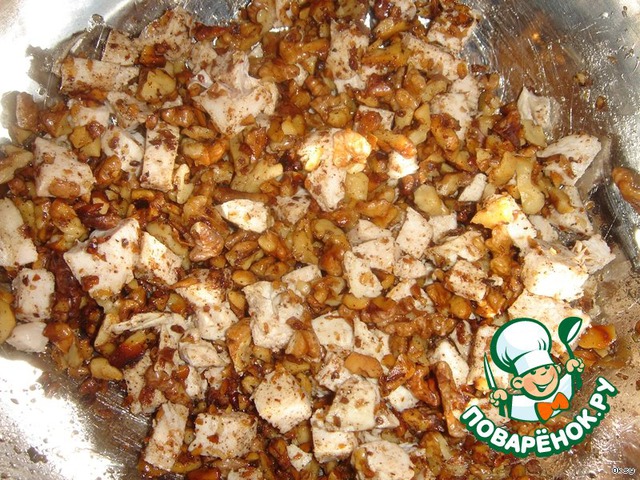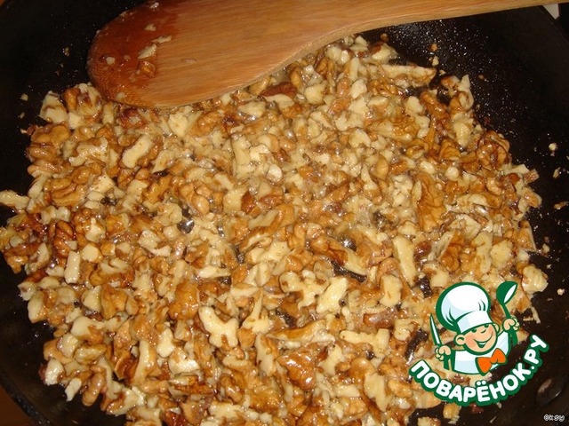Грецкие орехи слегка порубить и обжарить на сливочном масле. Они становятся необычайно ароматными.
