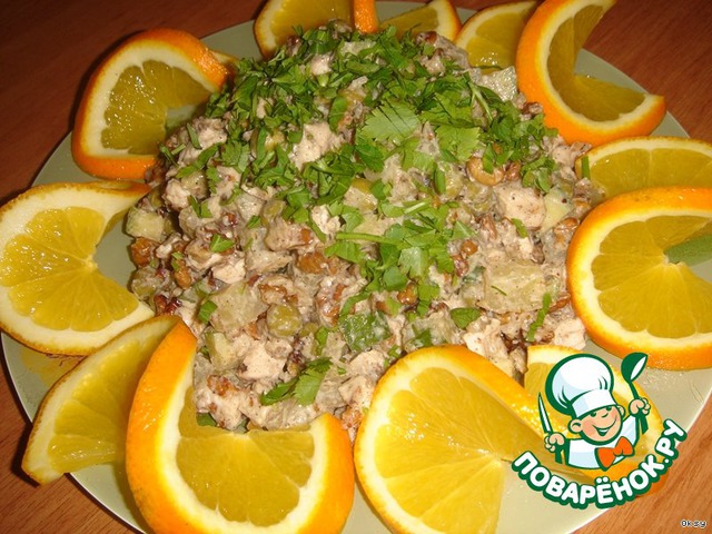 | Очень вкусный салат из курочки с грецкими орехами. Сытный, но при этом не тяжелый. А апельсин добавляет пикантности и делает салат праздничным. |