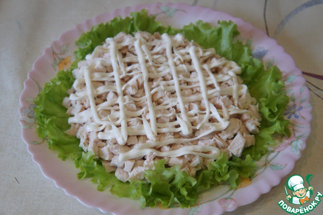 Сам салат выложить слоями. 1 слой - мясо, нарезанное кубиками, на которое нанести сеточку из майонеза.