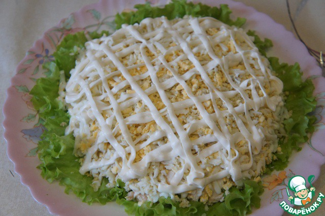 2 слой - яйца, натертые на крупной терке и снова сеточка из майонеза.