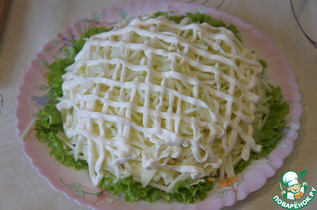 3 слой - яблоко, нарезанное тонкой соломкой и сеточка из майонеза.