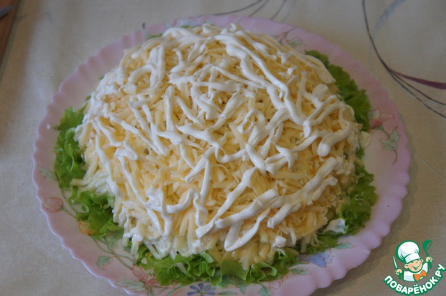 И, наконец, 4 слой - 100-150 г твердого сыра, натертого на крупной терке.
