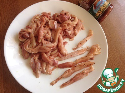 Филе курицы (у меня филе с бедра домашнего цыпленка) нарезаем вдоль на тонкие полосочки, посолить, перемешать с готовой острой аджикой ( по вкусу и желанию).