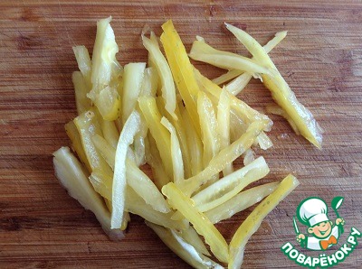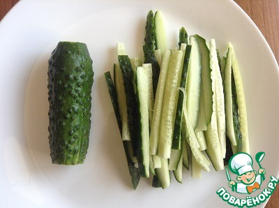 Три маленьких огурчика нарезаем вдоль соломкой.