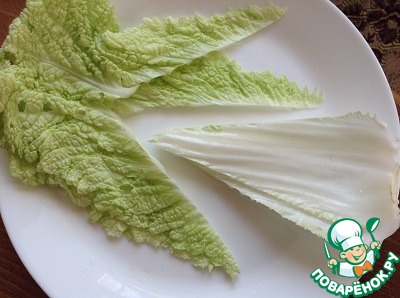 У пекинской капусты вырезаем толстую часть и эту (толстую часть) так же шинкуем соломкой.