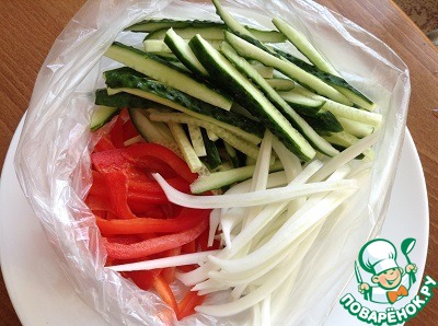 Пакет закрываем и отбиваем его об стол. Можно просто хорошо пожать пакет руками. Оставляем его, чтобы овощи пустили сок.