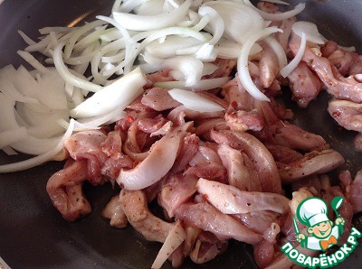 На оливковом (растительном) масле обжариваем курицу и нарезанную полукольцами луковицу в течение минут 7-10, до готовности курицы. Если будете использовать куриную грудку, сократите время до 5 минут.