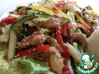 | Быстрый, сочный, легкий и вкусный теплый салат. По мотивам Тайской кухни. Готовится легко, подходит и для семейного обеда-ужина, и гостей порадовать можно. |
