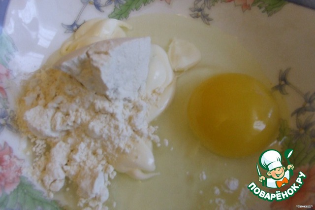 Возьмём миску, разбиваем одно яйцо, добавляем 1 столовую ложку майонеза и 1 столовую ложку муки. Соль и специи по вкусу. Все хорошо взбиваем.