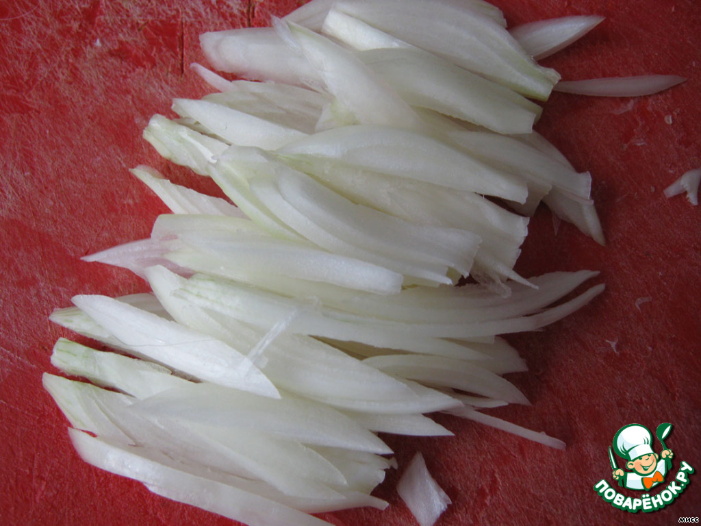 Тонкими полосками нарезаем лук. И обжариваем его на раскалённом масле.