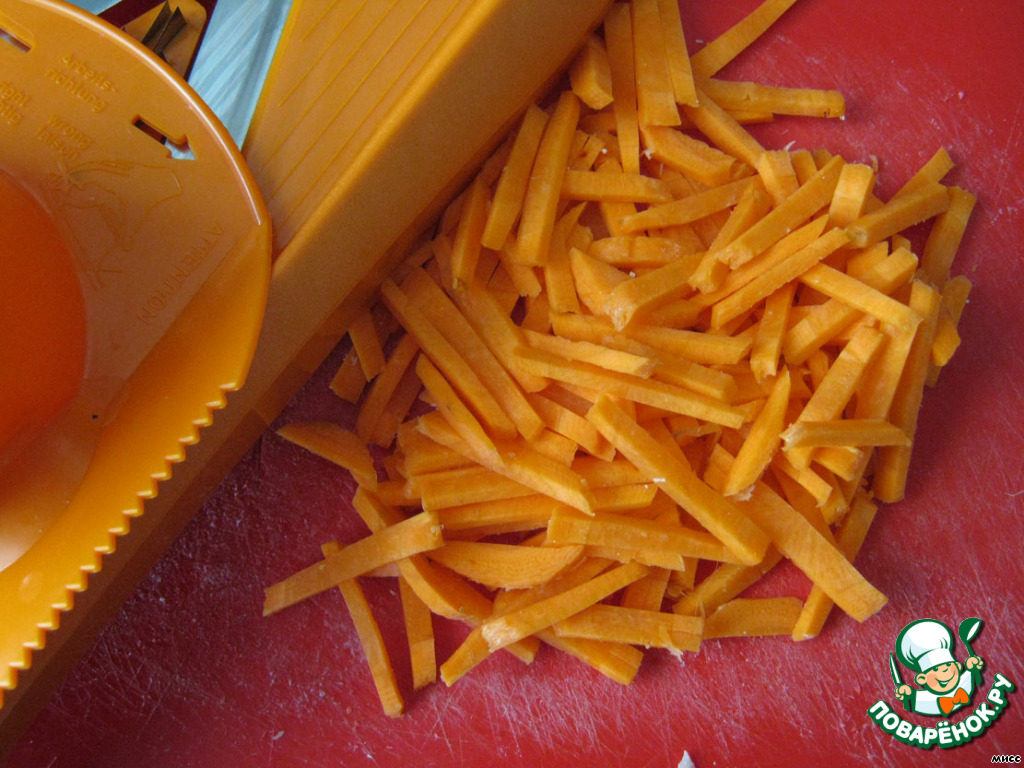 Тоникми полосками нарезаем (или натираем) морковь. И также обжариваем.