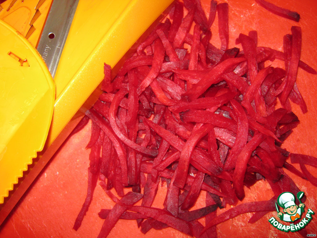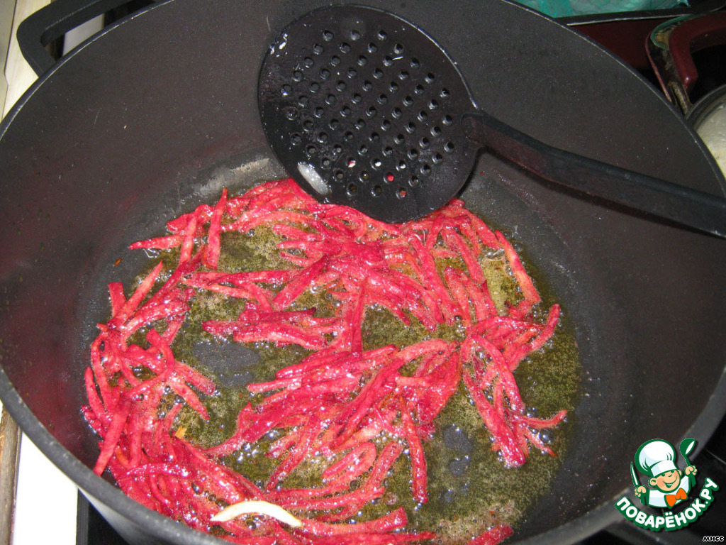 Обжариваем с добавлением уксуса, для сохранения цвета. Добавляем немного сахара.
