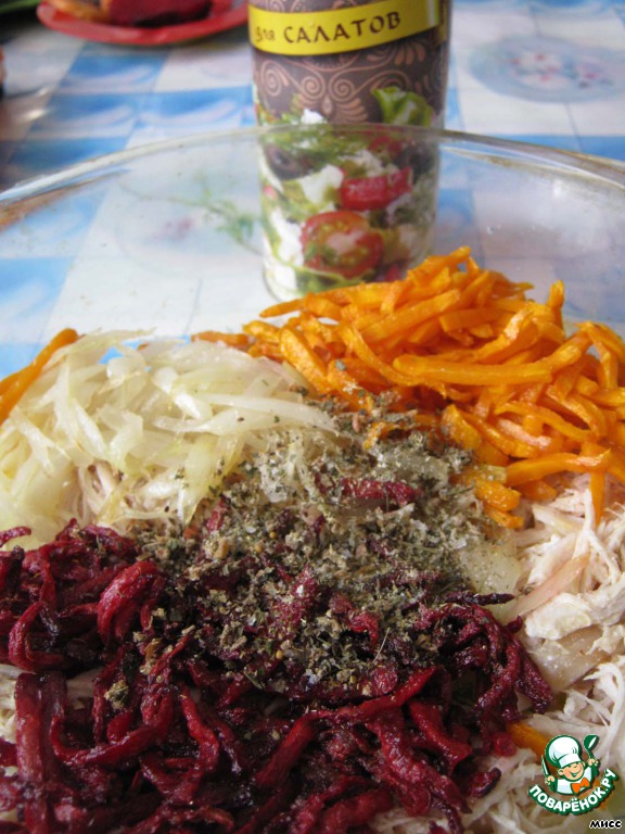 | Несколько необычный тeплый салат. Рецепт этого блюда был размещeн на сайте в 2007 году пользователем Оксана под названием "Бурятский салат" и иллюстрирован мной в рамках акции «Раскраски». |