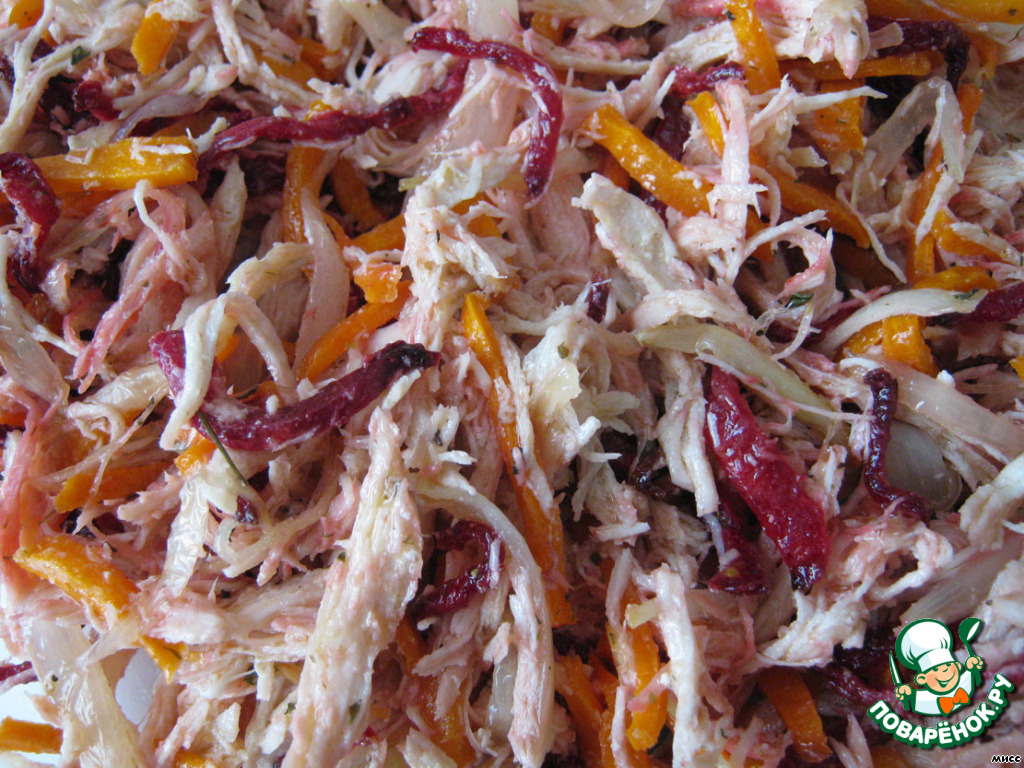 Все ингредиенты, обжаренные по отдельности, смешиваем с куриным мясом, добавляем приправу.