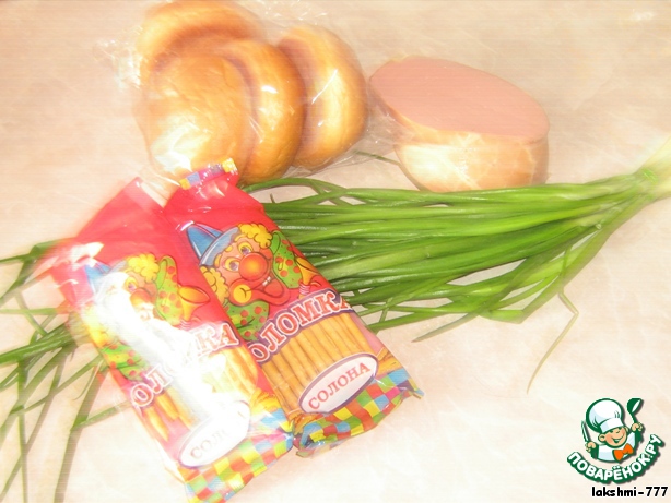 Продукты для корзинок: тостерные булочки, варёная колбаса, солёная соломка и зелёный лук с длинными перьями.