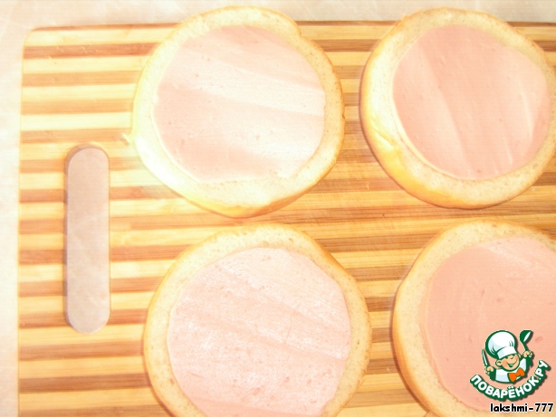 Из колбасы тоже вырезаем шайбочки (можно готовую найти такого размера) чуть меньше диаметра булочки. Если салат для корзинки будет не текучий, то можно обойтись и без колбасы.