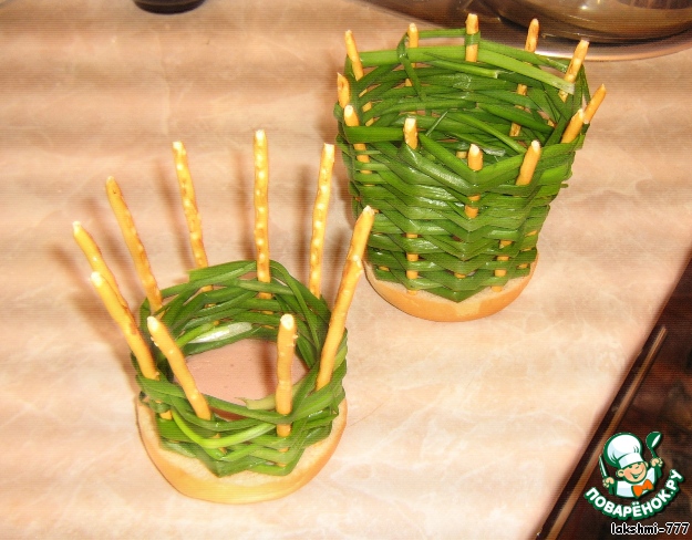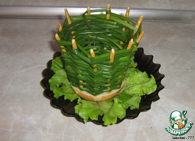 А дальше берём зелёный лук и начинаем переплетать между палочками в шахматном порядке.