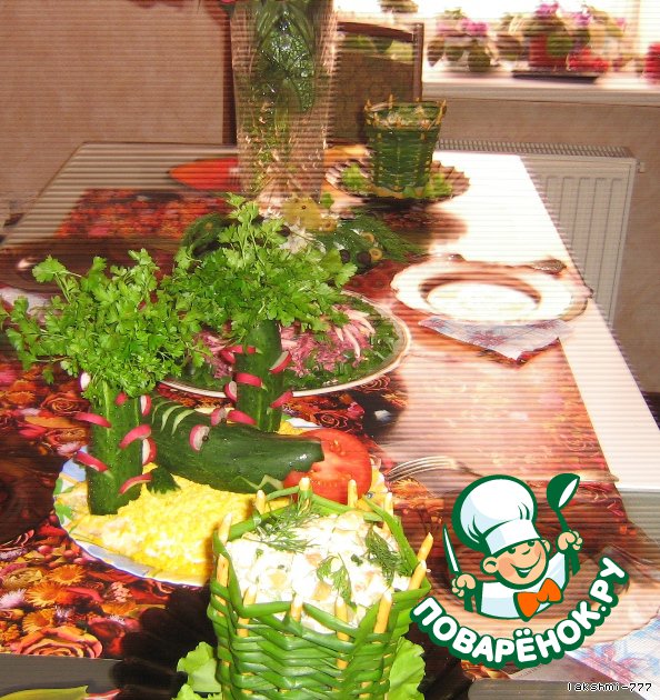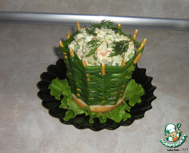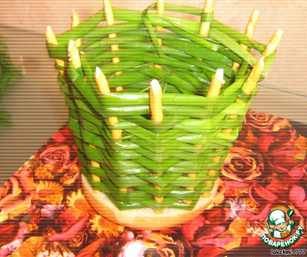 | Немного раньше я показывала корзиночку из сыра, теперь хочу показать из лука, с очень вкусным салатиком. Корзиночка отлично смотрится на праздничном столе. |