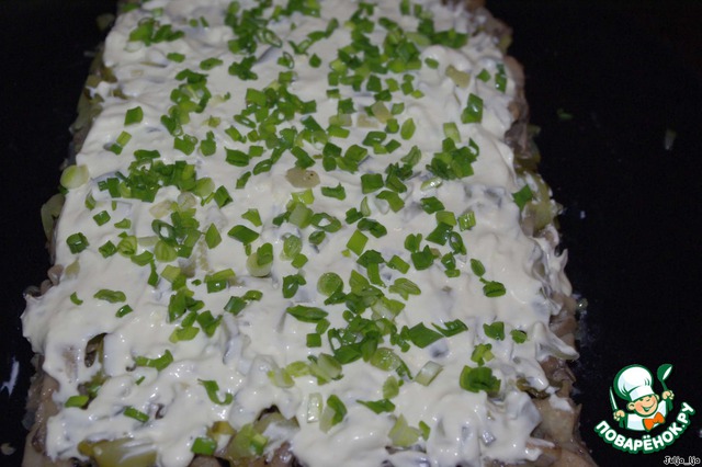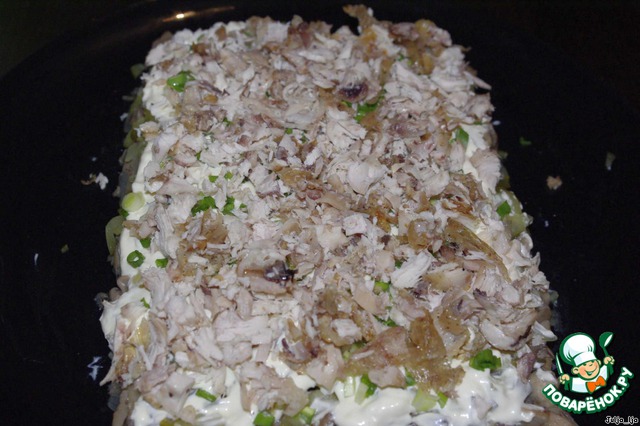 Мелко нарезаем зелёный лук, посыпаем частью салат. Далее, каждый смазываемый слой, посыпаем луком.