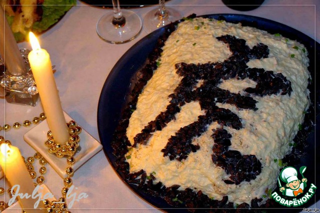 Из мелко нарезанных маслин, выкладываем любой орнамент, у меня иероглиф "Тигр". Салату даём постоять минимум 30 минут и подаём на стол.