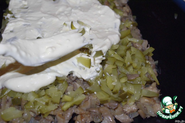 Маринованные огурцы нарезаем мелкой соломкой, выкладываем на грибы. Смазываем соусом.