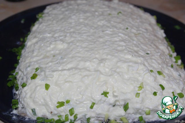 Последним слоем выкладываем белок, натёртый на тёрке, смешанный с оставшимся соусом. Белок можно немного посолить. Выкладываем ровным слоем на салат. Бока также покрываем смесью.
