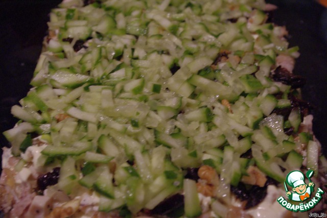 Далее чернослив распариваем, нарезаем соломкой. Выкладываем на салат вместе с орехами, нарезанными не очень мелко.