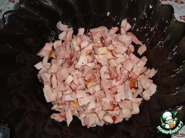 Грудинку тоже нарезать. Я брала копченый окорочек.