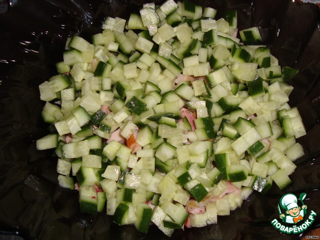 Все ингредиенты смешать, посолить и заправить майонезом.