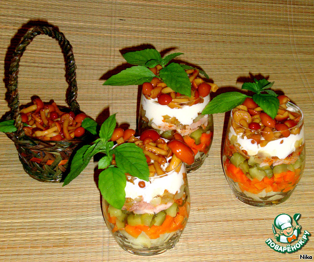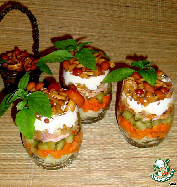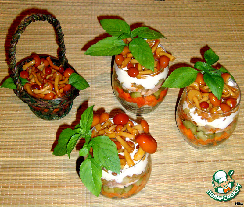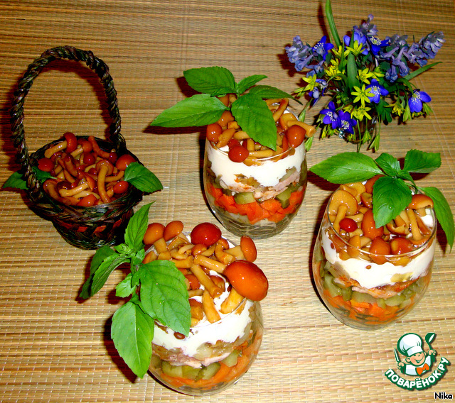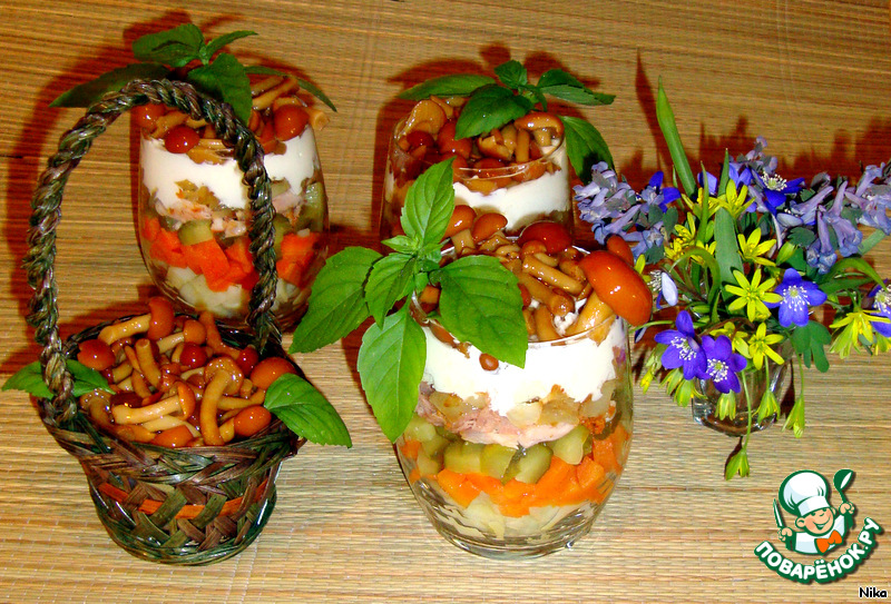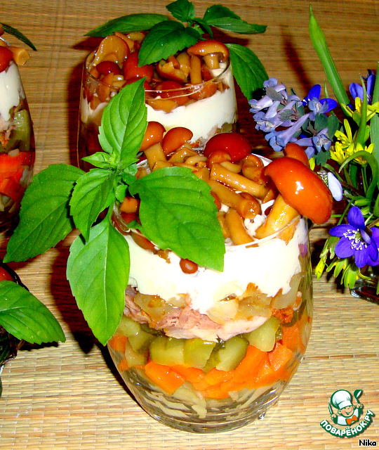 Каждый слой у меня повторяется по одному разу, 8 слоев. В оригинале слои повторяются дважды, 16 слоев. У автора рецепта маринованные шампиньоны. Я решила сделать салат с опятами. Цвет понравился, красивый, и ножки длинные.