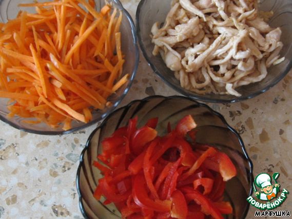 Курицу (филе) режем соломкой и обжариваем до готовности