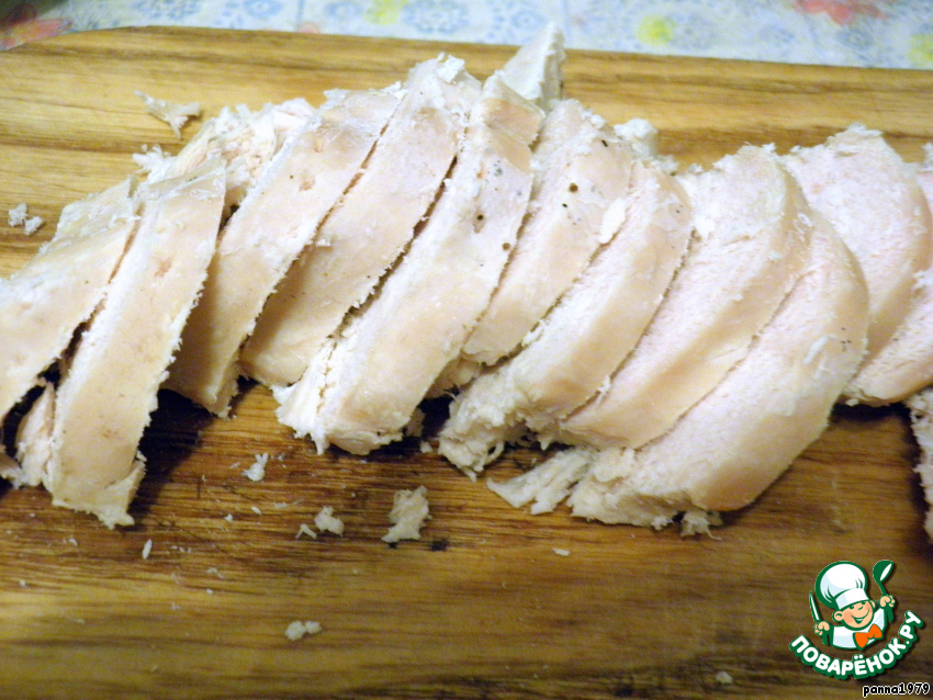 Куриное филе отвариваем в подсоленной воде до готовности. Охлаждаем и нарезаем тонкими ломтиками поперек волокон.