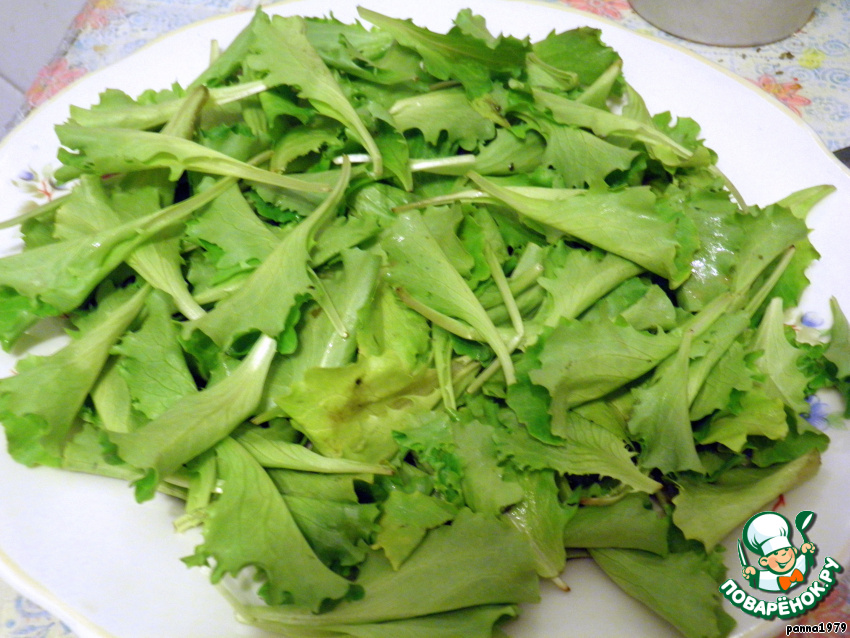 Зеленый салат помыть, стряхнуть воду и порвать листья руками (у меня салат с небольшими листьями и я обошлась без этого). Салатные листья выложить на плоское блюдо.