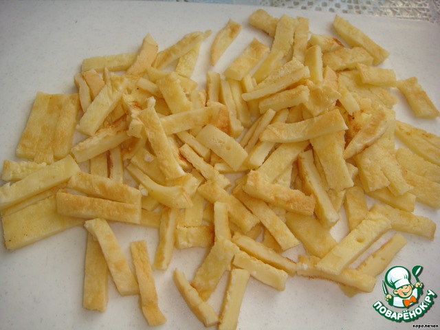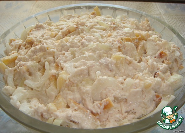 маринованый лучок отжать, смешать с грудкой, добавить нашу "соломку" из блинчиков, чуть посолить и заправить майонезом.