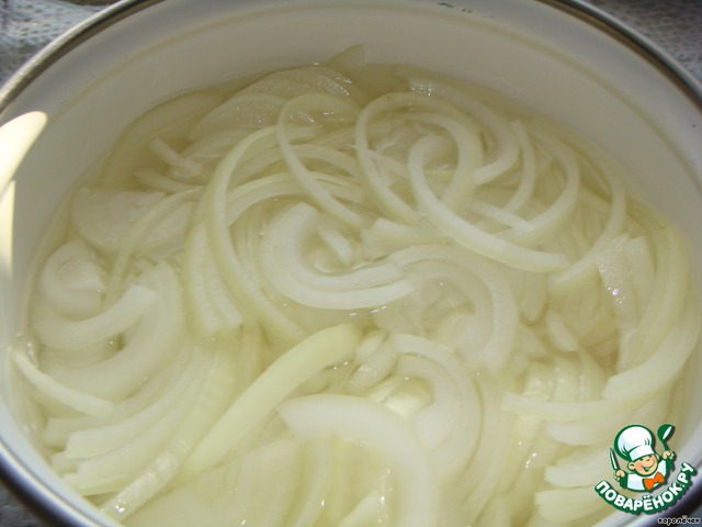 лук нарезать полукольцами и залить на 30 минут уксусом так, чтобы лук был весь покрыт - это в оригинале, но я заливаю 2/3 уксуса и 1/3 воды, тогда лучок будет не такой кислый, вобщем, это дело вкуса