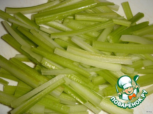 Сельдерей порезать брусочками 3-4 см, которые потом порезать вдоль соломкой.