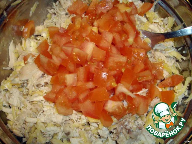 Нарезаем помидоры, опять-таки или кубиками, или соломкой.