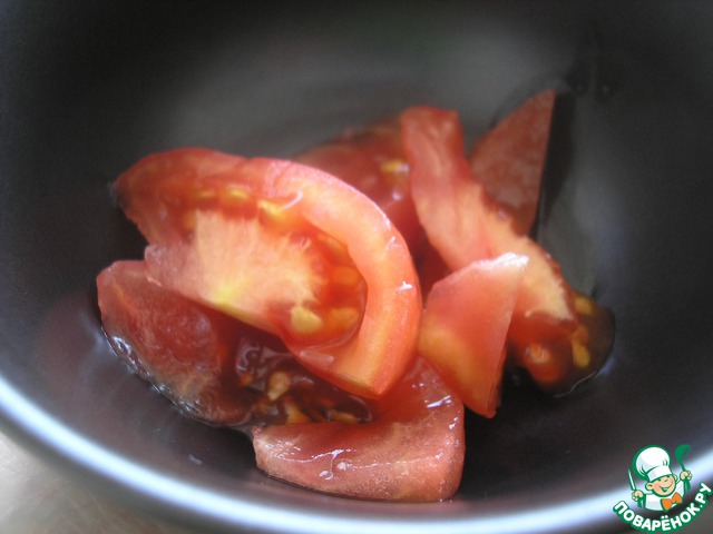 Разрезаем помидор пополам, а потом нарезаем дольками.
