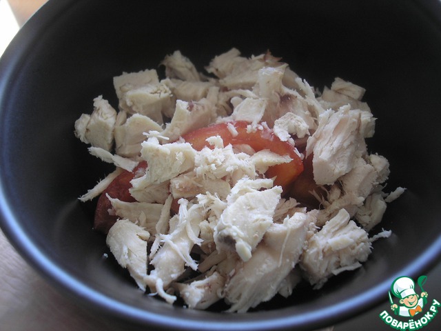 Отварное куриное мясо нарезаем небольшими кубиками и выкладываем на помидор, чуть-чуть солим, перчим.
