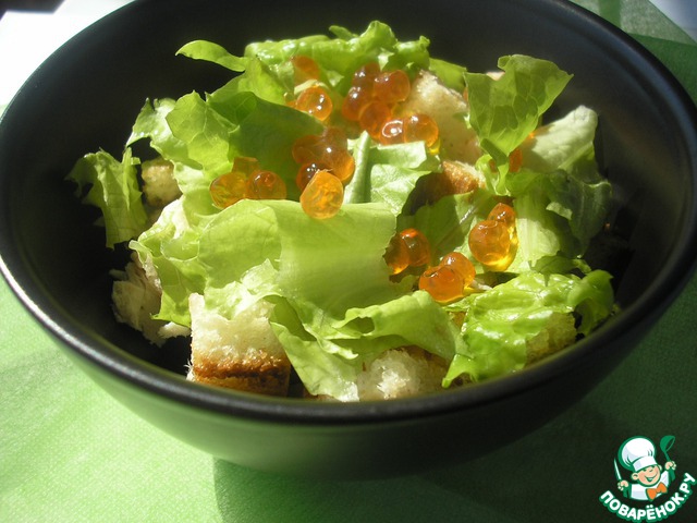 Заправлять салат нужно перед подачей на стол, чтобы сухарики оставались хрустящими.