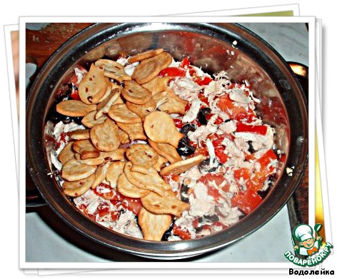 Куриную грудку порезать не очень крупно (к сожалению сделать фото нарезки грудки я забыла, но на фото видно, что она есть). Смешиваем порезанные овощи, оливки (немного оставить) и грудинку + крекер (немного его поломать, я это сделала уже после (также оставить для украшения , если нужно будет).
