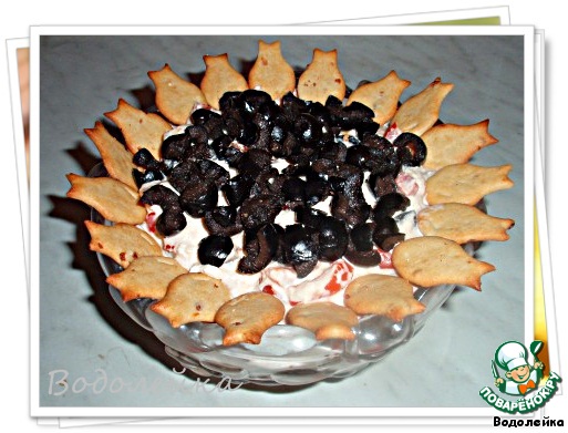 Если вы собираетесь подавать так, то выложить по кругу остатки крекера (имитируя лепестки цветка) и в середину выложить отложенные оливки (это как бы серединка).