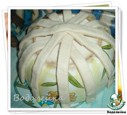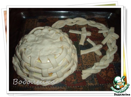 Готовое слоеное тесто разрезаем на полоски шириной 5-6мм. Салатную тарелку (стеклянную или керамическую) переворачиваем дном вверх, смазываем сверху растительным маслом и начинаем плести корзинку: сначала раскладываем вертикальные полоски...