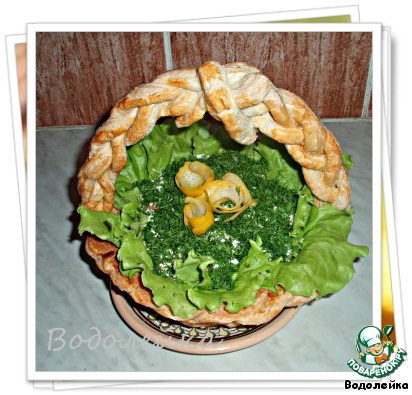 В готовую корзинку выложить листья салата и выложить сам салат. Сверху присыпать рубленной зеленью (это будет у нас зеленая травка) и украсить по желанию. Я сделала цветочки из лимона.